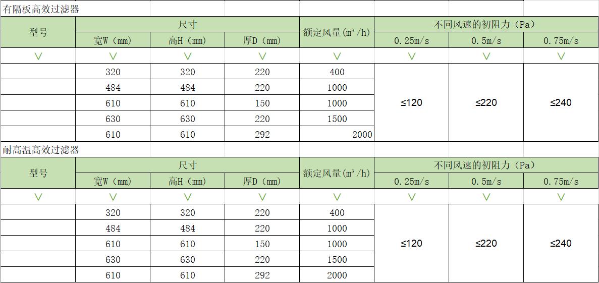 高效過(guò)濾器主要用于捕集0.5um以下的顆粒灰塵及各種懸浮物,作為各種過(guò)濾系統(tǒng)的末端過(guò)濾。參數(shù)如下: